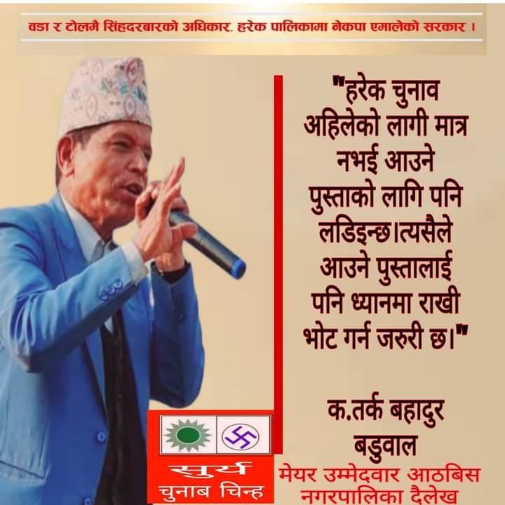 मलाईं आठबीसका जनताको विश्वास साथै पार्टिको मार्गनिर्देशन अनुसार अडिग रही काम गर्दै आएको हुनाले मेरो पार्टि नेकपा एमालेले पूर्ण विश्वास गरि यति खेर मलाई आठबीस नगरको प्रमुखमा मनोनयन गरेको छ । यस अवस्थामा यस नगरका आदर्णिय आमा बुवा,दाजुभाई, दिदि बहिनी सबैलाई मेरो पार्टि नेकपा एमालेको सूर्य चिन्हमा छापलगाई मलारई साथै पार्टिलाई अत्याधिक मतले विजय गराउनु हुने छ, भन्ने पूर्ण विश्वास गरेको छ ।धन्यवाद ।।