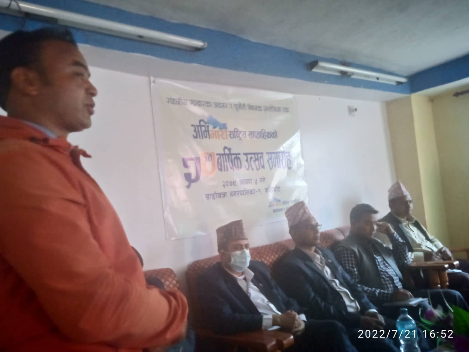 आउन ५,कालिकोट । अभिभारा राष्ट्रिय साप्ताहिकको २०औं बार्षिक उत्सव समारोह सम्पन्न भएको छ । अभिभारा राष्ट्रिय साप्ताहिका व्यवस्थापक माधव उपाध्यायको अध्यक्षता तथा सान्नीत्रिबेणी गाउँपालिका अध्यक्ष मोहनबहादुर केसी (महेश)को प्रमुख आथित्यता एवम् प्रमुख जिल्ला अधिकारि रामहरि र्शमाको बिषेश आथित्यतामा कार्यक्रम गरिएको हो।