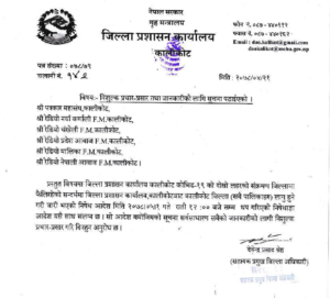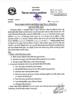 ललित बिष्ट श्रावण २१,मान्म। कालिकोट जिल्लामा कोरोना महामारीको सङ्क्रमण रोकथामका लागि थप १० दिन निषेधाज्ञा गरिएको छ। साउन २२ गते राति देखि लागुहुने गरी भदौ १ गते सम्मको लागि निषेधाज्ञा थप गरिएको सहायक प्रमुख जिल्ला अधिकारी देविन्द्र प्रसाद श्रेष्ठले जानकारी दिनुभयो ।