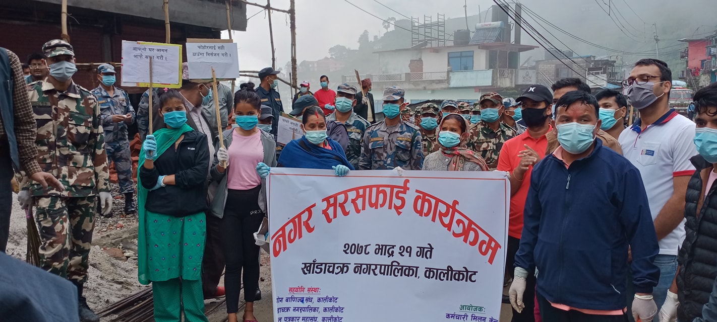 भाद्र २१,मान्म। कालिकोट जिल्लाको खाँडाचक्र नगरपालिकाको बजार क्षेत्रलाई सरसफाई गरीएको छ।सोमबार कर्मचारी मिलन केन्द्र कालिकोटको आयोजना तथा उद्योग बाणिज्य संघ,खाँडाचक्र नगरपालिका र नेपाल पत्रकार महासंघ कालिकोटको समन्वयमा जिल्लाको जिरो पईन्टबाट प्रतिमा चोक सम्मको बजार क्षेत्रलाई सफा गरीएको हो।
