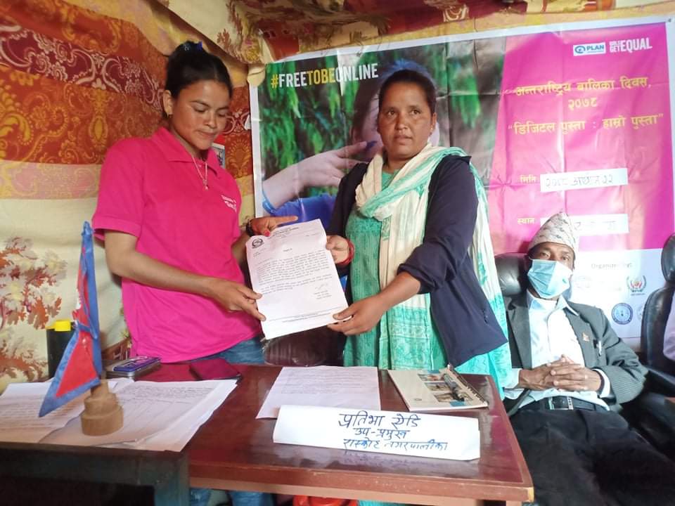 असोज २२,कालिकोट। रास्कोट नगरपालिका-२ का १९ वर्षीेया किशोरी प्रतिभा ऐडि एक दिनका लागि उप-प्रमुख बनेकी छन्।अन्तर्राष्ट्रिय बालिका दिवसको अवसरमा प्लान इन्टरनेशनल नेपाल हामी दाजु भाइ मानव अधिकार तथा बातावरण बिकास केन्द्र (हुरुन्डेक) नेपाल कालिकोट लगायत संस्थाले संयुक्त रुपमा आयोजना गरेको गल्र्स टेकओभर कार्यक्रम अन्तर्गत coc क्लबकी अध्यक्ष रहेकी ऐडि लाई रास्कोट नगरपालिका कि उपप्रमुख मिमसरा बम शाही ले शुक्रबार एक दिनका लागि उपप्रमुख को पद हस्तान्तरण गरेकी हुन् ।