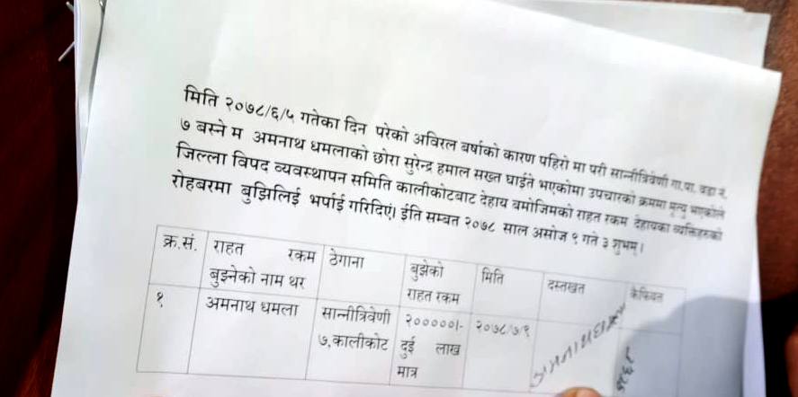 कार्तीक ९,कालिकोट। कालिकोट जिल्लामा असोज ५ गते परेको अबिरल बर्षाका कारण पहिरो सहित रुख आएर ज्यान गुमाएका परीवारलाई राहात बितरण गरीएको छ । रास्कोट नगरपालिका ४ मा पर्ने लडेखोलामा वर्षाले ढालेको रुख लागेर मृत्यु भएका शान्नि त्रिवेणी गाउँपालिका वडा नं. ७ का २३ बर्षीया सुरेन्द्र धमलाका परीवारलाई जिल्ला विपत ब्यबस्थापन समितिले राहत बितरण गरेको हो ।