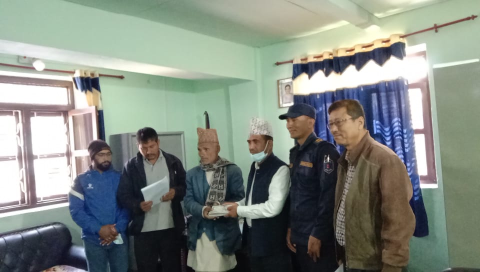प्रमुख जिल्ला अधिकारी कृष्णप्रसाद आचार्यले मंगलवार जिल्ला प्रशासन कार्यालयको आफ्रनै कार्यकक्षमा मृतक सुरेन्द्र धमलाका बुवा अमनाथ धमलालाई दुईलाख रुपैया रकम हस्तान्त्ररण गर्नुभएको हो । संघिय सरकारको मापदण्ड अनुसार जिल्ला विपत ब्यबस्थापन समितिले राहात रकम उपलब्ध गराउने निणर्य गरेको र सोहि अनुसार राहत रकम हस्तान्त्ररण गरीएको प्रमुख जिल्ला अधिकारी आचार्यले जानकारी दिनुभयो ।