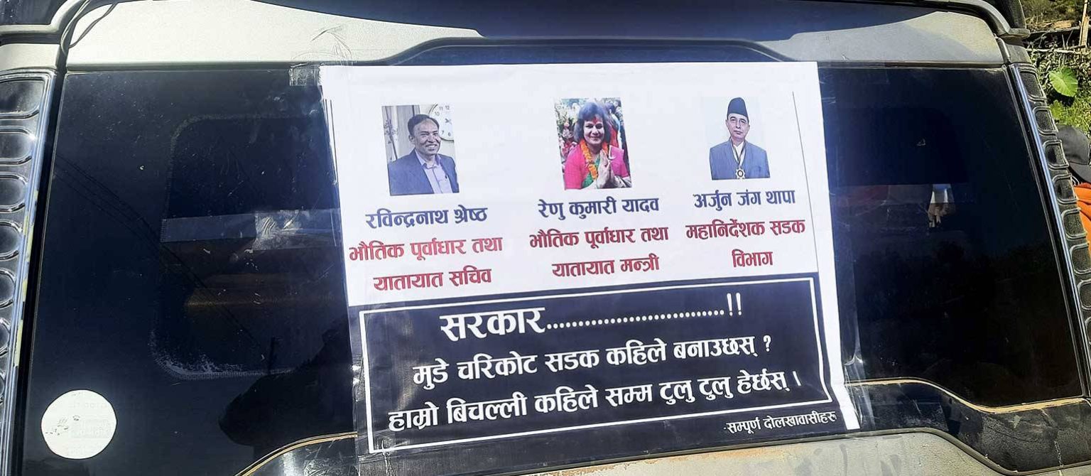 काठमाडौं । दोलखाको मुडे–चरिकोट खण्ड वर्षौदेखि अलपत्र परेपछि स्थानीय भौतिक योजनामन्त्री रेणुकुमारी यादव, सचिव रवीन्द्रनाथ श्रेष्ठ र सडक विभागका महानिर्देशक अर्जुनजंग थापाको तस्बिरसहितको फ्लेक्स सार्वजनिक सवारीसाधनमा टाँसेर विरोधमा उत्रिएका छन् ।